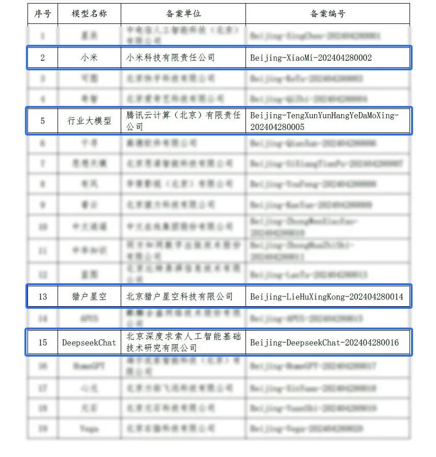 与猎户星空大模型一同通过生成式人工智能服务备案的还有小米大模型、腾讯云行业大模型、DeepseekChat大模型等。