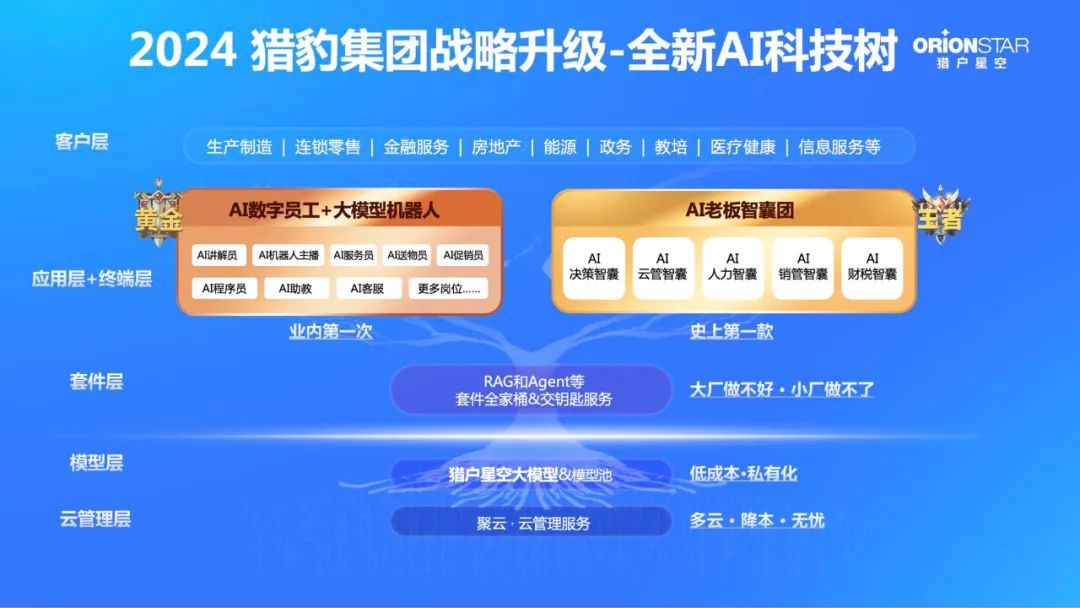 猎户星空着力打造“AI 科技树”,在实现大模型能力的基础上,从底层云管理服务、模型及套件层的套件全家桶和交钥匙服务,过渡到应用及终端层的AI数字员工+大模型机器人、AI老板智囊团,最终完成客户层的落地,技术架构紧密关联、层层递进,为客户提供闭环大模型应用体验。