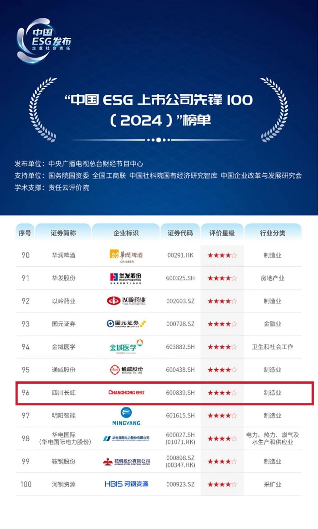 长虹荣登“中国ESG上市公司先锋100”榜单