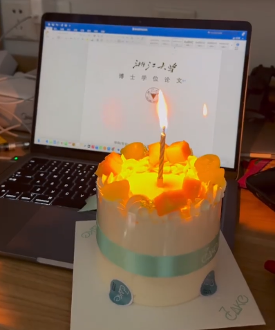 这位准博士充满仪式感地点燃了小蛋糕上的蜡烛,虔诚地许下了心愿: