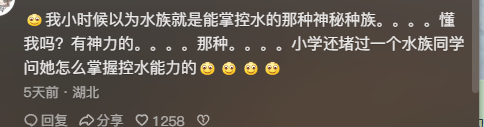 有网友表示,小时候一直以为水族是能控制水的神秘种族,还曾逼问过自己的水族同学如何控制水?
