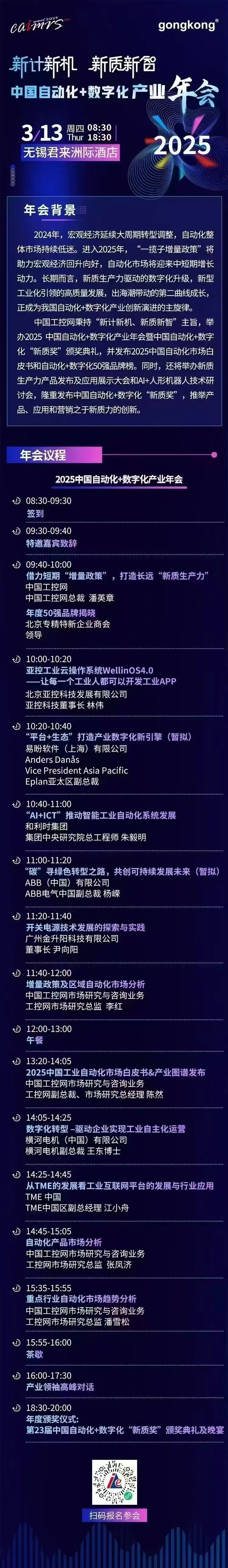 3月13日,由中国工控网主办,中国信息通信研究院工业安全中心、北京专精特新企业商会、中国机电一体化技术应用协会支持的2025 CAIMRS即将震撼来袭。本届大会以“新计新机  新质新智“。在这里,不同行业的思想将激烈碰撞,老牌企业携成熟工艺与市场洞察,新兴力量带奇思妙想与果敢锐气,专家学者捧前沿理论与技术突破,企业领袖握战略眼光与布局谋略。他们将以高屋建瓴之姿探讨产业发展新路径,以前瞻布局之谋擘画未来蓝图,为行业持续繁荣注入磅礴动力。