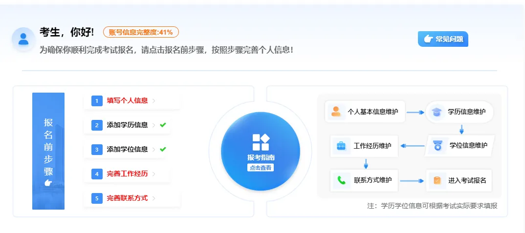 登录中国人事考试网报名系统,添加学历信息,完善工作经历,完善联系方式。待到“账号信息完整度”为100%时才可进入考试报名。
