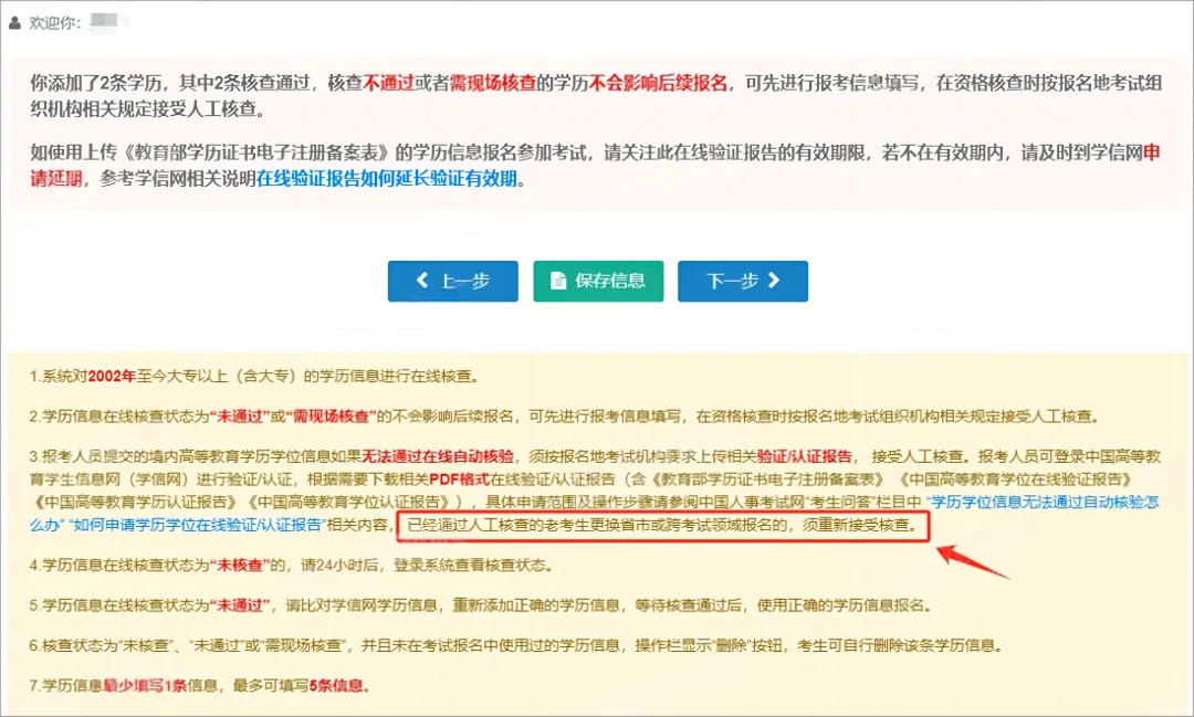 报考人员提交的境内高等教育学历学位信息如果无法通过在线自动核验,须按报名地考试机构要求上传相关验证/认证报告, 接受人工核查。报考人员可登录中国高等教育学生信息网(学信网)进行验证/认证,根据需要下载相关PDF格式在线验证/认证报告(含《教育部学历证书电子注册备案表》 《中国高等教育学位在线验证报告》《中国高等教育学历认证报告》《中国高等教育学位认证报告》),具体申请范围及操作步骤请参阅中国人事考试网“考生问答”栏目中 “学历学位信息无法通过自动核验怎么办” “如何申请学历学位在线验证/认证报告”相关内容, 已经通过人工核查的老考生更换省市或跨考试领域报名的,须重新接受核查。