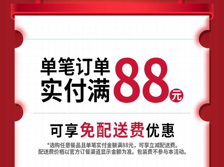 选购任意餐品且单笔实付金额满88元,可享立减配送费。配送费价格以官方订餐渠道显示金额为准。包装费不参与本活动。