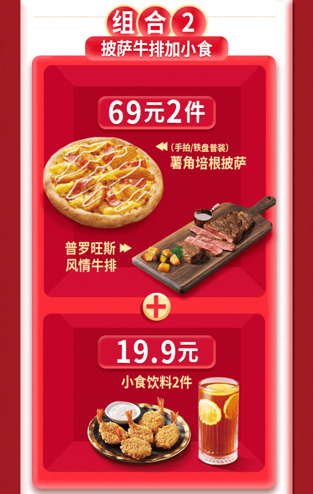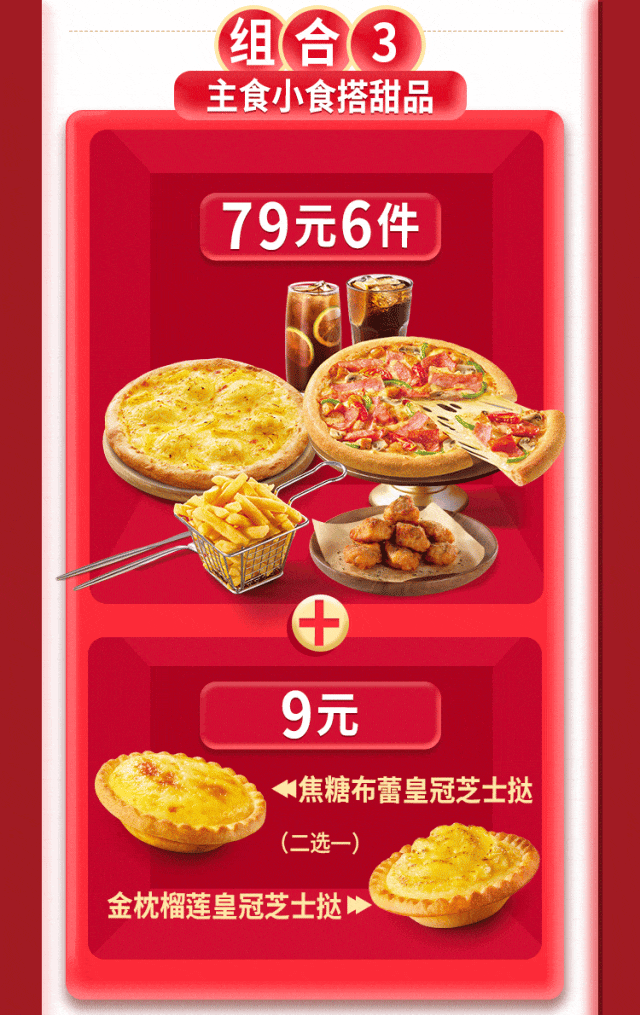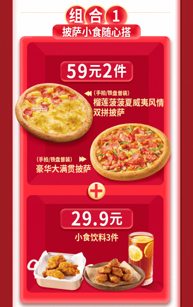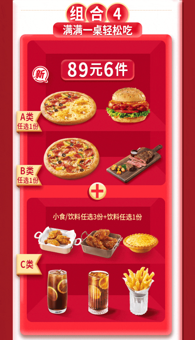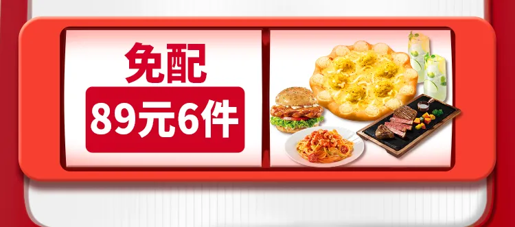 2) 活动②:通过自助点餐外带自取或自有外送渠道,可以89元选购【6件披萨小食饮品套餐】1份。
