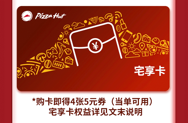 必胜客宅急送权益服务协议说明购宅享月卡,可享如下权益:在必胜客宅急送官方网络点餐,单笔订单实付满20元(不含外送费、包装费)立减5元;有效期:生效后30天内有效期内可使用次数:4次,单日限用2次售卖城市:全国除苏州市/郑州市/杭州市用卡须知:1.具体权益规则及活动规则详见必胜客APP尊享会员卡版块宅享卡的权益说明。2.本卡不适用于西藏自治区必胜客餐厅,不适用于机场、火车站、高速公路、旅游度假、游乐场、展览馆、Bistro、Express、Les Elites、奥特莱斯、精选餐厅以及必胜客部分特定餐厅,详洽餐厅;3.必胜客付费会员卡项下的有关会员服务将在您成功开通付费会员卡时即时自动生效。一旦您成功开通必胜客付费会员卡,必胜客会将您购买付费会员卡所支付的费用(如有)作为付费会员卡会员服务费并作即时收取,该等会员服务费不会因您中途主动消费服务或终止资格而作退还;4.除本页面有关权益详情说明外,相应会员权益及付费会员卡使用方式见必胜客APP中“必胜客付费会员卡”版块之《必胜客付费会员卡-用户须知》的相应说明;5.如有疑问,请致电必胜客客服热线(4009-701-890),或咨询必胜客在线客服,在线客服工作时间(09:00-21:00)。