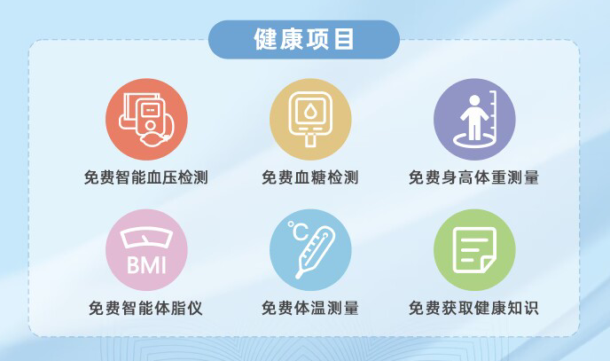 我们为您提供免费的血压监测、免费血糖检测、免费智能身高体重测量、免费智能体脂仪测量,请您到“健康角”领取“预防三高健康促进再提升”健康知识折页,凭折页进行免费检测。