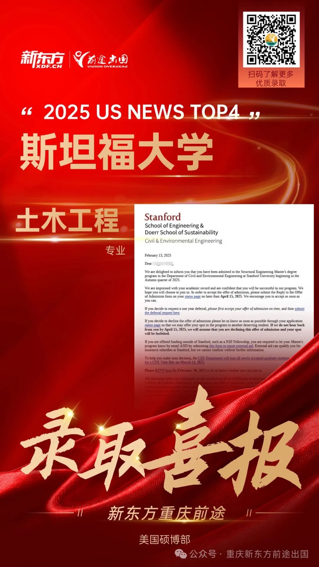 官网没有显示往年录取数据,根据新东方历年录取大数据分析,斯坦福土木工程硕士整体录取率在33.9%,平均录取GPA3.7,平均录取托福106。