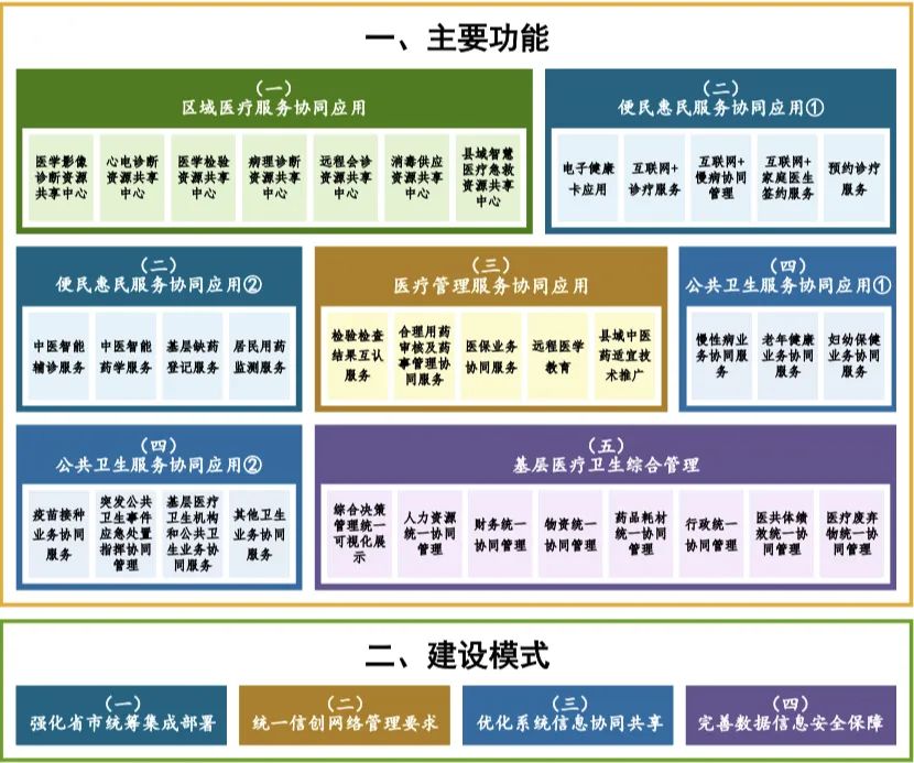 四是公共卫生服务协同应用,包括慢性病、老年健康、妇幼保健、疫苗接种、突发公共卫生事件应急处置指挥、基层医疗卫生机构和公共卫生、其他卫生等业务协同服务的7项信息化功能。