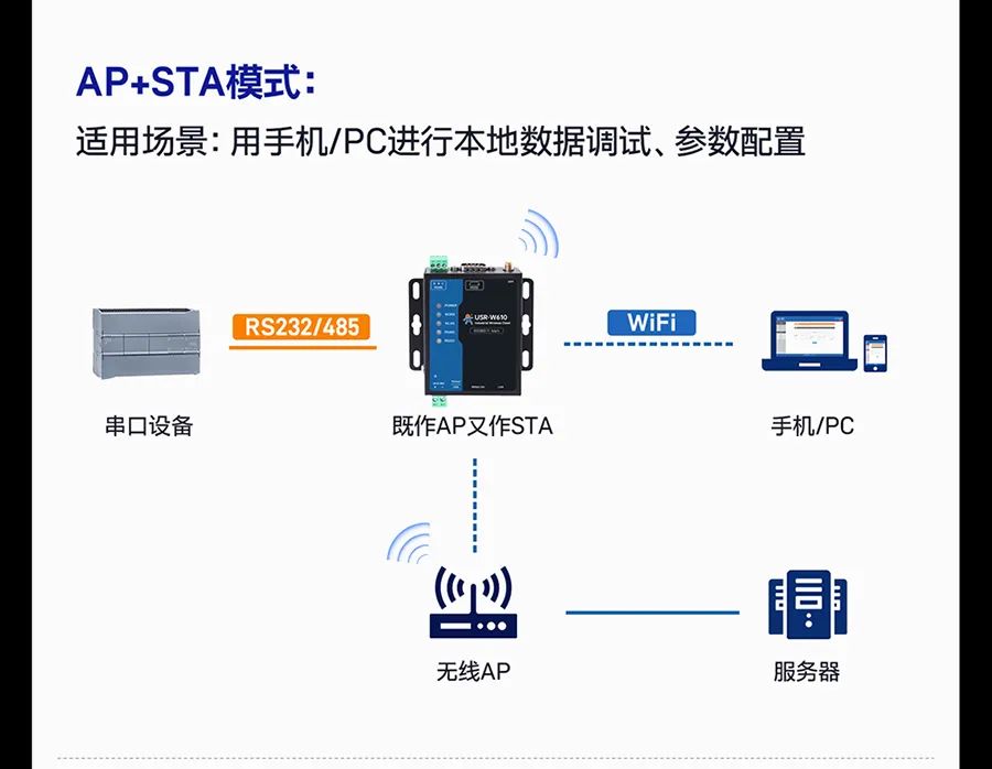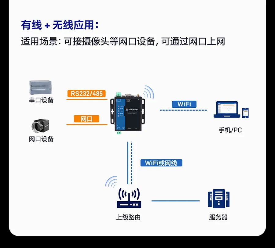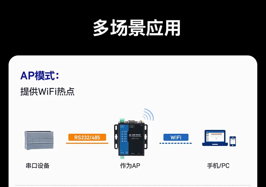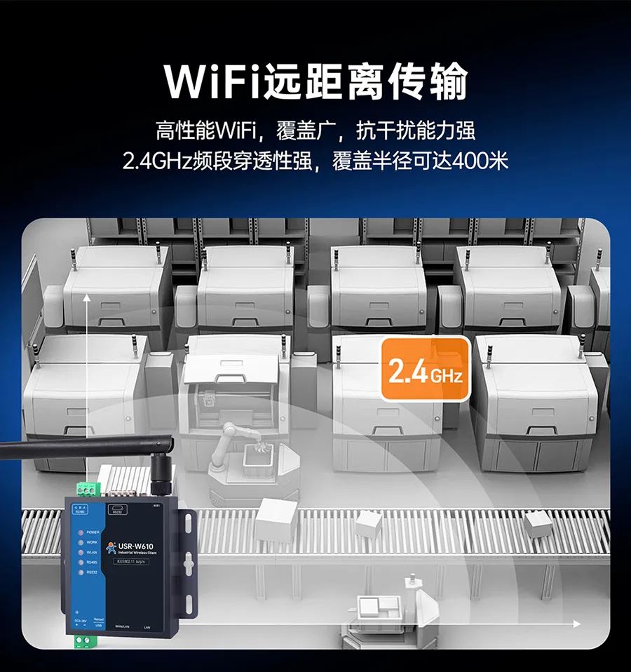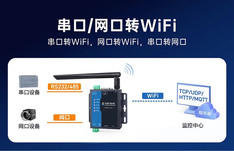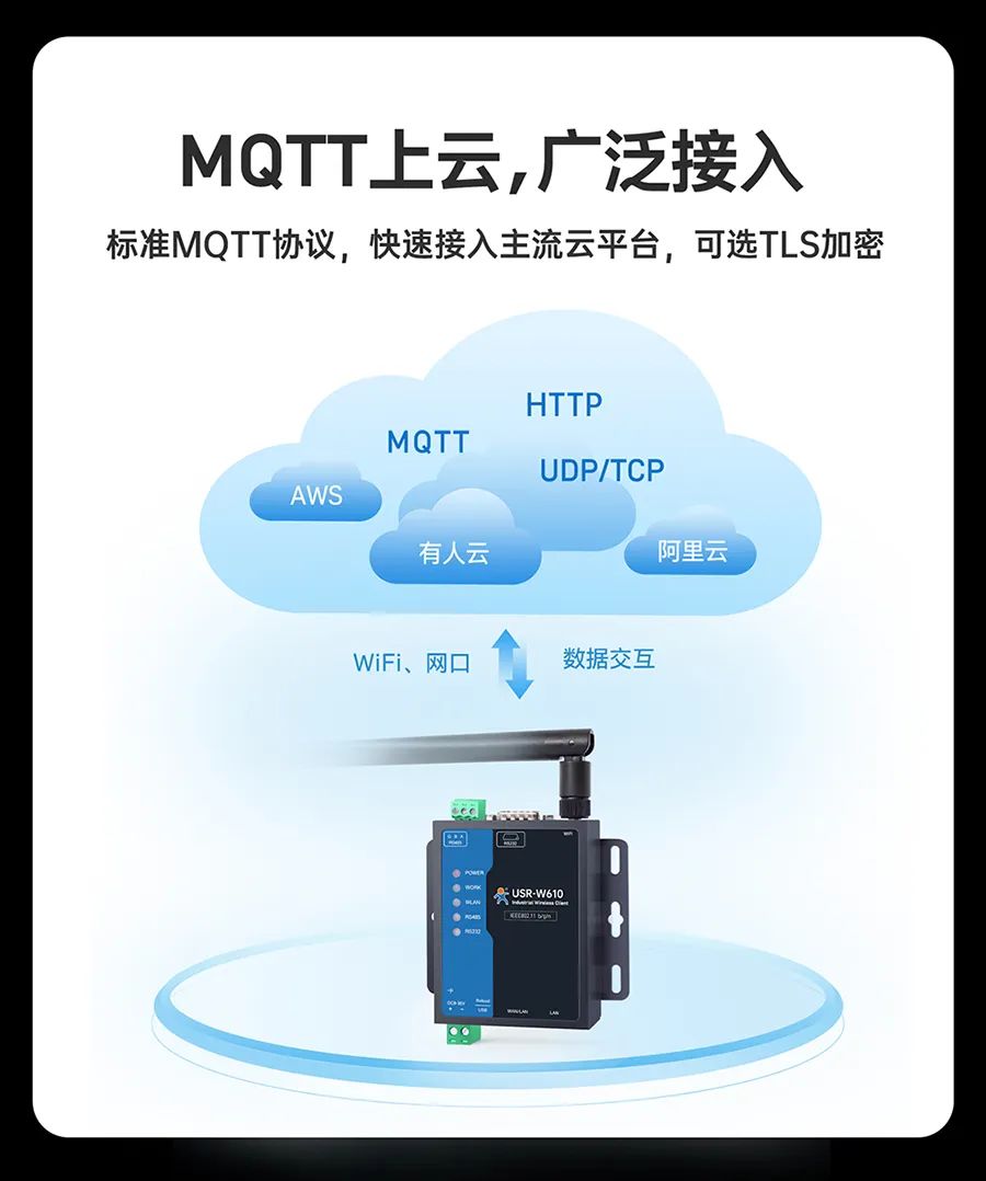 大型物流园区里,叉车穿梭、金属货架林立,普通 WiFi设备信号时断时续,数据传输卡顿成常态?—— W610(高通版)搭载高通方案,抗干扰能力拉满!2.4GHz 频段覆盖,400米超远距传输,即便在大型工厂、仓储物流园区中,信号也能稳如“老司机”。智慧园区需要同时连接监控摄像头和环境传感器,传统设备只能单模式运行,调试费时费力?—— W610(高通版)支持 AP/STA/AP+STA/桥接/路由五大模式自由切换,满足不同的网络架构需求。工厂PLC控制器、农业大棚温湿度传感器、能源监测站电表水表......设备数据还得跑腿人工抄录?—— W610(高通版)双网口和双串口设计,RS485/RS232独立工作,10/100M 自适应网口,实现串口转网口、网口转 WiFi 无缝衔接,设备间的互联互通变得超简单。内置标准 MQTT 协议,能够快速接入AWS 云、阿里云、有人云等主流云平台,TLS 加密护航数据安全!在能源监测、智慧工厂等场景中,借助 MQTT 上云功能,设备数据能实时上传至云端进行分析处理,为企业决策提供有力的数据支持,实现智能化管理。支持有人云平台、Web页面、SNMP 远程管理,随时随地“云操控”,只要有网络,就能对设备进行参数配置、数据调试、固件升级等操作。