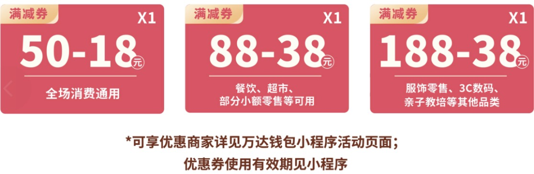 新用户成功开通“万达帮你付”,可享3张满减券任领1张。