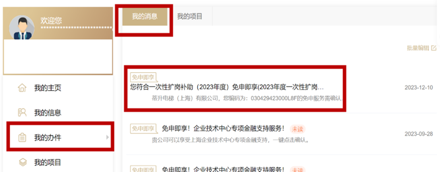 1、短消息提醒:经大数据比对初步符合补助条件的社保缴费地为黄浦的企业,“一网通办”平台通过站内信精准推送企业补助意愿确认及企业信息更新的通知。