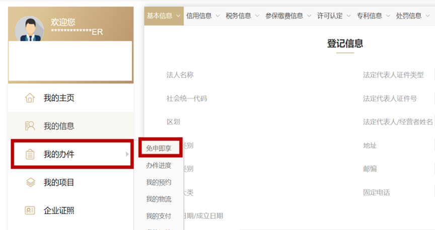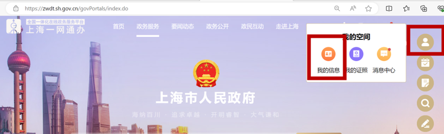 企业凭“法人一证通”或“电子营业执照”登录上海市“一网通办”门户网站,找到“我的信息”,根据红色框标识逐步点击,直至最终完成确认。