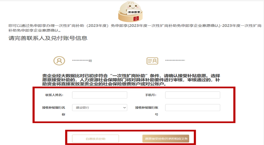 3、“一网通办”平台企业确认页面需填写以下信息:联系人姓名、手机号、接收补助银行名称、接收补助银行账号。企业选择 “愿意接受补助并承担相应义务”时相关信息为必填项。