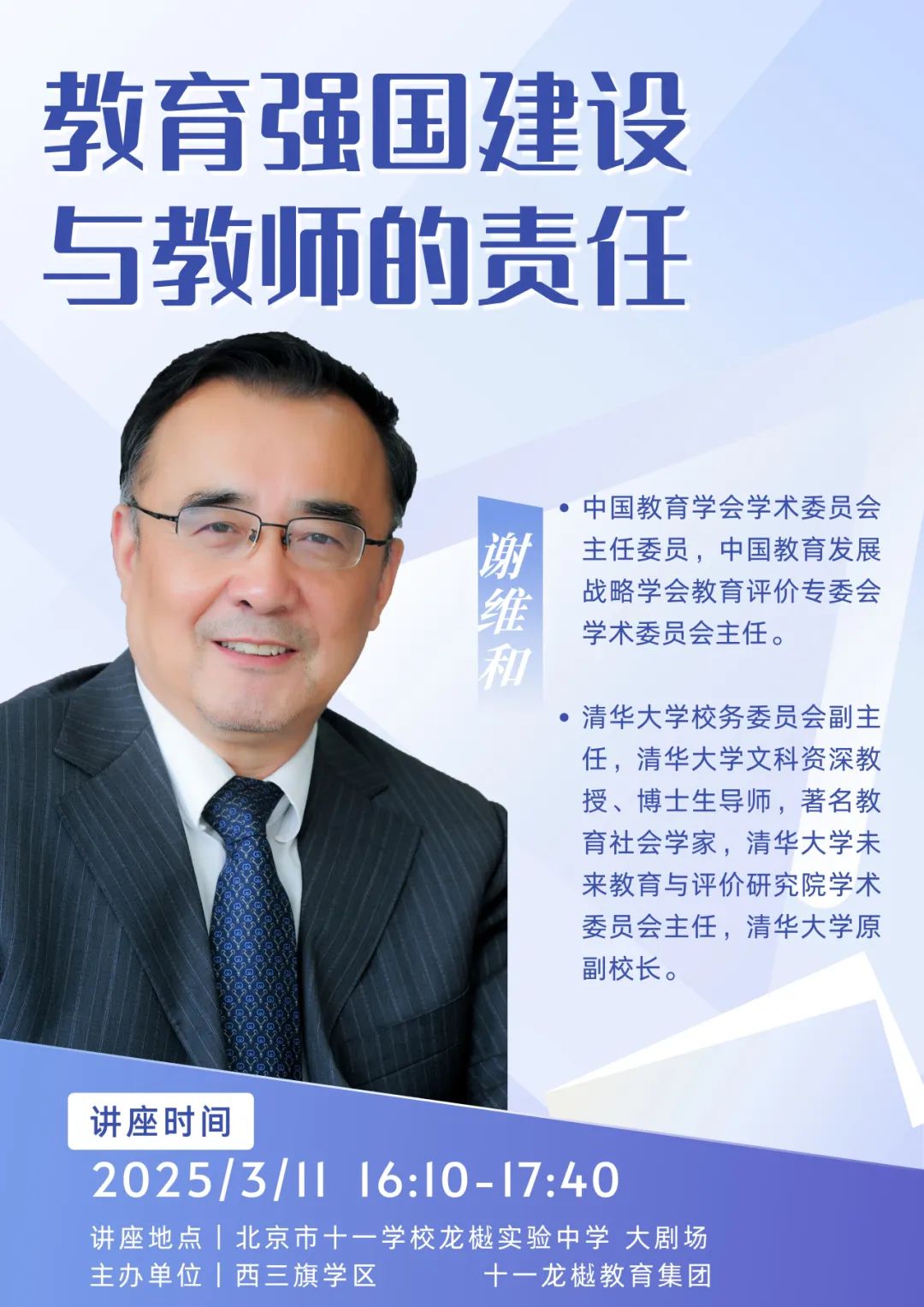 2025年3月11日下午,为落实《教育强国建设规划纲要(2024-2035年)》,西三旗学区与十一龙樾教育集团共同在十一龙樾中学大剧场举办了一场意义非凡的讲座。本次讲座主讲人为清华大学谢维和教授,十一龙樾教育集团教师和海淀区西三旗学区学校教师代表参加了本次讲座。