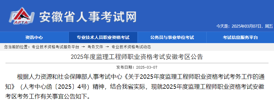 根据人力资源和社会保障部人事考试中心《关于2025年度监理工程师职业资格考试考务工作的通知》(人考中心函〔2025〕4号)精神,结合我省实际,现就2025年度监理工程师职业资格考试安徽考区考务工作有关事宜公告如下。