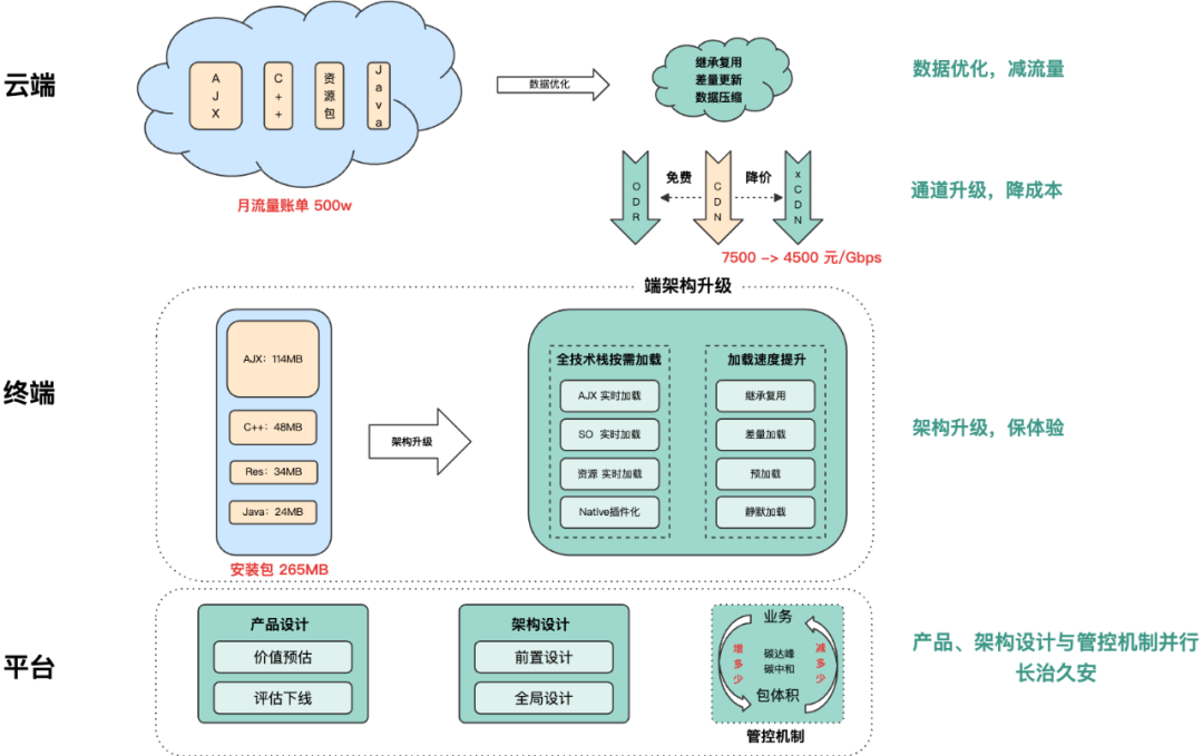 包大小重点不只是反映体积大小的表象,更重要的是反映架构臃肿,代码债高筑,稳定性、性能和效率风险成比例上升的问题。这就像减肥,过分胖了不止是形象问题,他是一种身体不健康表征,隐含着心脑血管并发症等整体机制问题。同样包大小优化表象目标上是降体积,根本目标是整体的技术架构健康,是对整个应用各个已有模块进行架构简化、瘦身增肌,同时长序地对新增模块进行良好的架构设计。因此,在具体落地过程中我们关注两个方面:对于降体积,上云是一个常用手段,但上云很容易带来流量成本上涨,所以从目标上我们降体积和降流量并举,避免姿势变形,拆东墙补西墙。并从整体架构上提供端云一体的全栈按需加载能力和降流量能力,在云端通过数据压缩,继承复用,差量更新进行数据优化,来减少流量;在通道上,通过升级ODR和xCDN能力,实现流量降成本;在终端通过全技术栈按需加载能力,降低包体积,并通过预加载、静默、差量加载来保证包大小降低的同时,用户数据加载体验不受损。用户体验是综合题,包括流畅、稳定、存储、能耗等,一项项见题解题,很容易治标不治本,根本上需要产研架构设计的机制和素养的形成。所以,在推动包大小优化过程中,主要的不是包大小指标,而是更关注是否有架构设计以及设计的合理性,长期全局的架构设计要求从一开始业务设计判断上就融合考虑。所以在平台上,终端团队建立数据管控机制,从一个需求开始到下线全生命周期中每个环节中,都要保证架构的前置和全局设计。