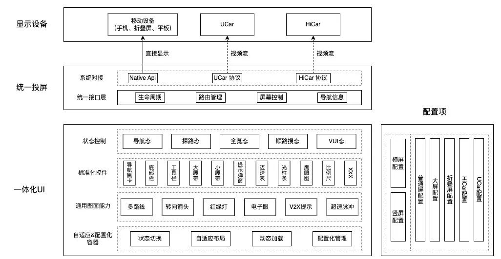 由于地图应用场景的广泛性,高德地图终端不但需要支持多尺寸手机、平板、手表等移动设备,还需要支持各种车机投屏。各设备单独定制适配与维护会消耗大量人力成本,因此,整体设计了多屏合一框架,封装统一投屏接口层,组合地图面、标准化控件、状态控制一体的 地图UI 设计,通过自适应布局能力让一套方案能够支持多种投屏协议以及设备屏幕。同时,增强配置化设计,支持不同设备屏幕尺寸、屏幕方位下的灵活扩展、动态加载和高效定制。