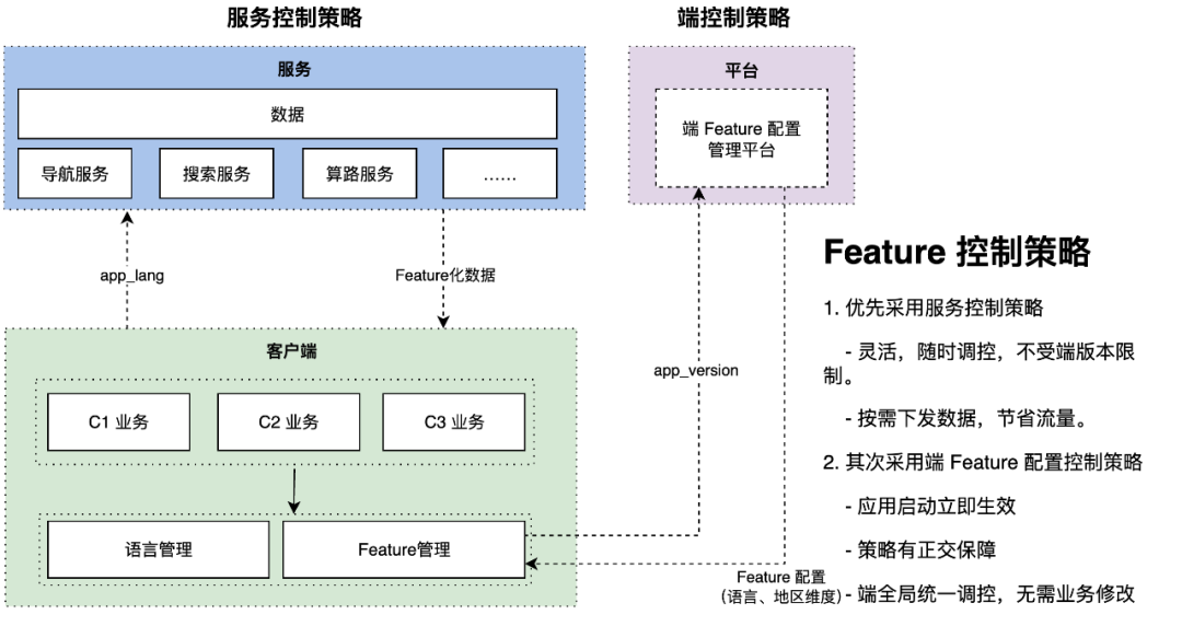 随着高德国际化的发展,需要在不同国家提供不同功能与语言,甚至还需要满足包体积、不同平台的要求,因此整体上设计了一套配置化框架来实现多应用形态,满足国际图、包体积、多平台的不同需求。配置化设计由两种通道组成,一种是将当前语言标识上传的服务,服务根据语言不同下发相应数据,端侧根据数据进行展示,从而实现功能的配置,这种通道适用于类似信息瀑布流的服务数据驱动场景。另一种则对于功能逻辑存在于终端本地(如启动、导航链路)的场景,通过对UI组件标签进行不同语言环境下的配置,根据配置进行相应展示,实现端侧 Feature 化的配置。两种通道相互协同,能更灵活应对全球化场景下的多语言、多功能需求。