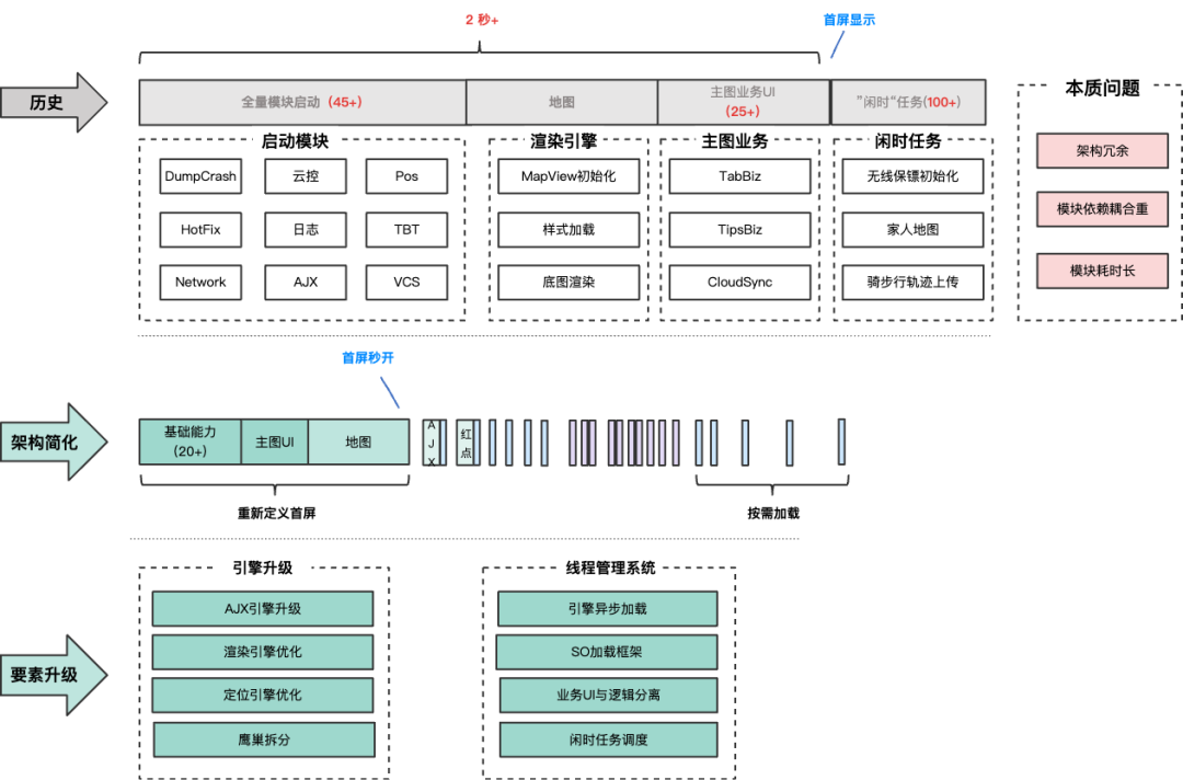 整体设计统一容器,向下统一封装适配多环境(包括多设备、多系统、多语言、多网络、多规则),解决业务需要各自分别高成本适配各种环境的问题;向上对业务提供跨平台、可复用、一致性的一体化地图终端能力(包括Engine、UI、Service、IO、Framework),支撑多业务的快速迭代。在技术栈设计上,除调用系统平台服务的部分使用原生语言(Java//OC//ArtTS)外,其他均使用跨平台语言,来实现最大限度的跨平台,其中对于高性能要求的能力(如地图引擎、基础库)使用C++实现,而对于高效率要求的能力(如前端页面)则使用JS实现。这样在满足性能的要求下,实现一码多端的高效跨平台开发。篇幅所限,这里仅从启动秒开、包体积瘦身、多系统、多设备、多语言等几个方面,具体介绍我们的思考与实践。过去,很多能力只管功能完成,而性能问题往往被推到上线前做决策,结果常常“带伤”上线。一旦上线,这些遗留问题因为优先级低,很难再被安排优化,即上线即终点,管生不管养,这就导致问题越积越多,最后只能运动式解决,再周而复始。这就能理解为什么运动式优化,优化之后又快速反弹的原因。无论是启动性能、包体积还是存储,都存在类似的问题。为此,针对启动性能,我们在App上制定了“秒开”的高目标,这个目标回头来看也极具挑战性,这样也倒逼我们打破过去路径依赖的思维模式,实现结构性的简化。此前整个端的架构是,所有业务模块都是在启动阶段无差别的进行初始化,比如音乐模块,即使用户不开启音乐,也会在应用启动阶段进行加载初始化。这就导致启动阶段,随着时间业务发展,越来越慢,而且每次治理后很快就会反弹。因此,终端团队通过按需加载框架的设计,一方面,实现从“全功能加载”到“即用即加载”的结构性简化,根据用户实际需求动态加载模块,减少资源浪费和性能开销。另一方面,重新定义首屏启动模块,对启动模块极致简化,同时在结构上解耦启动与具体业务,这样也避免了启动性能因后续业务迭代而恶化,做到了长治久安。从结果看, 在低端机(17年 PIXEL手机)上,都能够实现启动秒开。同时,运行一年以来,在业务快速发展下,耗时持续保持平稳。