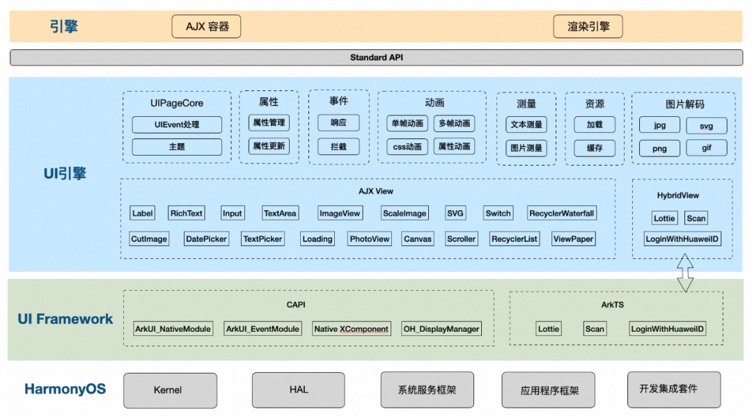 随着设备及系统不断增多,每个系统都有自己的生态开发语言与服务特点,如果每个系统单独开发势必成本会越来越大,高德终端团队一直思考如何做到用一套代码跨平台运行来支持多系统产品。我们在各系统之上设计封装了系统服务与交互组件的平台层,基于自研的与地图深度融合的跨平台AJX前端引擎,搭建了高性能的跨平台容器环境,支持业务一次JS语言开发、多系统多设备运行。正得益于此,我们能够鸿蒙系统快速适配,在业内率先支持鸿蒙 NEXT系统。在鸿蒙系统适配过程中,遇到了一些技术难点。鸿蒙提供的原生开发方式是ArkUI,因为其动态语言的特性,导致用其来开发平台层组件时,整体性能不理想。于是我们联合华为推进性能更高的C语言的CAPI方案演进,CAPI是ArkUI的底层绘制接口,由C语言编写,具有更好的性能以及系统一致性的体验。但应用CAPI方案也存在一些问题:一个是组件丰富度不全;另一个是一些三方模块比如lottie是以ArkUI方式提供的,代码上万行,如果翻译到CAPI上成本巨大;三是CAPI有很多枚举、万能接口,直接用成本高,易出错。我们设计了通用UI引擎,封装抽象一体化的UI套件,提供给上层开箱即用,同时,向下也支持灵活扩展其他UI库。另外建设HybridView层将CAPI不支持的复杂组件桥接到ArkUI层,在保证整体性能的同时,避免了CAPI组件不足影响业务快速迭代的问题。