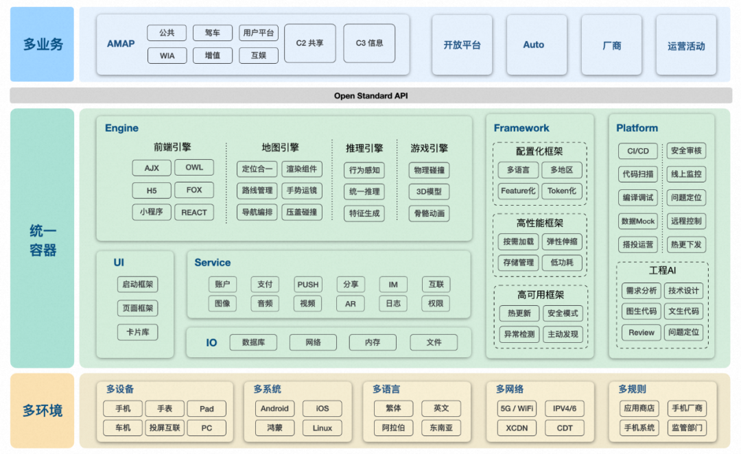 「高效率」通过“一体化容器架构”的结构化升级,我们实现了一套架构支撑多系统、多设备、多语言和多业务,支撑国际图上线,同时在业内率先支持鸿蒙 NEXT 系统。高德终端团队“不仅要把问题解决了,方式上更是要从技术架构和机制层面根本解题” ,这篇总结与各位技术伙伴分享与探讨过程中的探索与实践,希望能有所助益。过去,终端技术治理的惯性更倾向于遇题解题、单点局部运动式解题。但随着持续发展,技术债务逐渐累积,这种方式带来的成本越来越高,而且效果会反复恶化,经常出现“按下葫芦起了瓢”的情况。因此我们思考需要从这种“局部优化”到“结构性简化”的转变,用一套架构统一支撑多系统、多设备、多语言,才能系统性解决面临的问题。围绕这一方向,我们从顶层整体设计并落地了一体化容器架构: