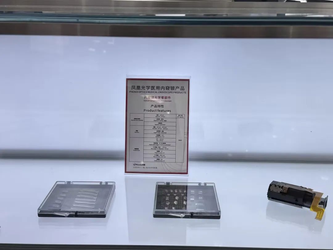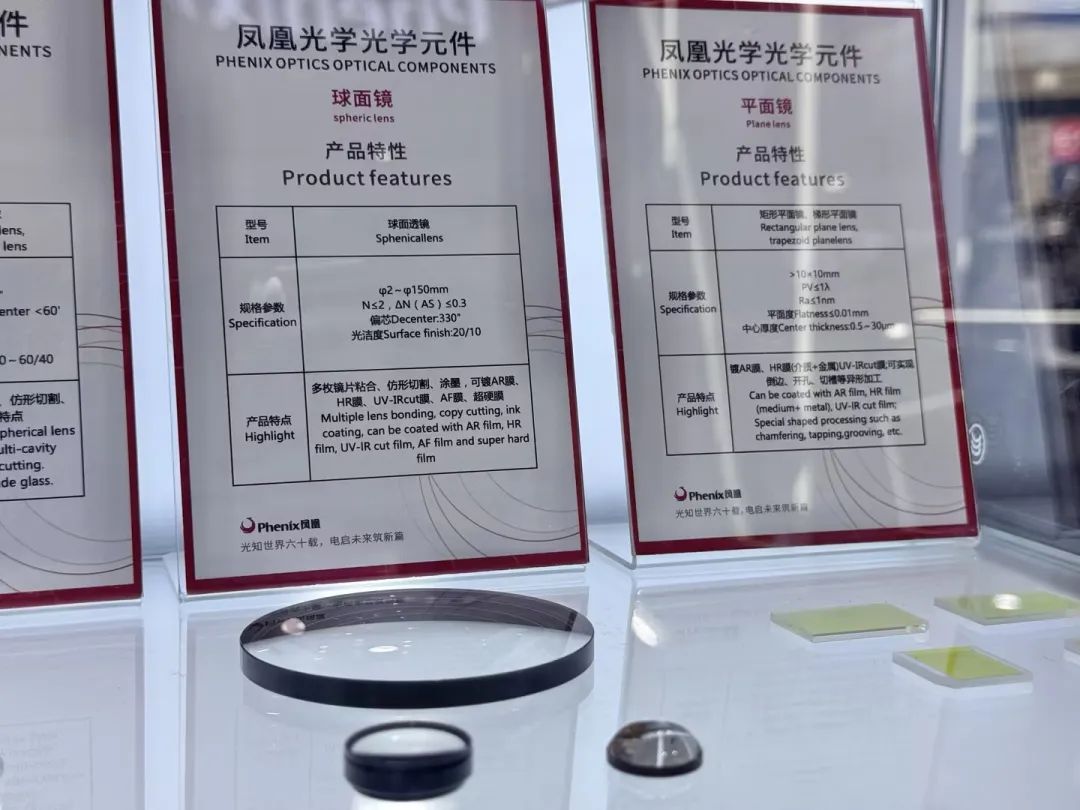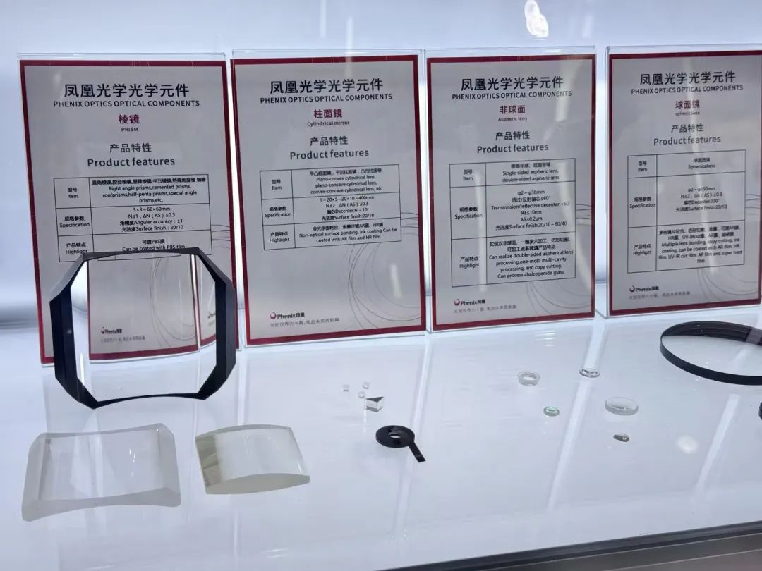 本次展会,凤凰光学展示了各类镜片,包括球面镜、平面镜、非球面、柱面镜以及棱镜。