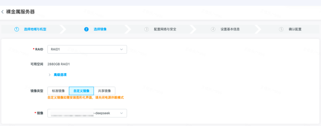 2.金山云裸金属服务器控制台创建流程,选择内置DeepSeek满血版的自定义镜像创建