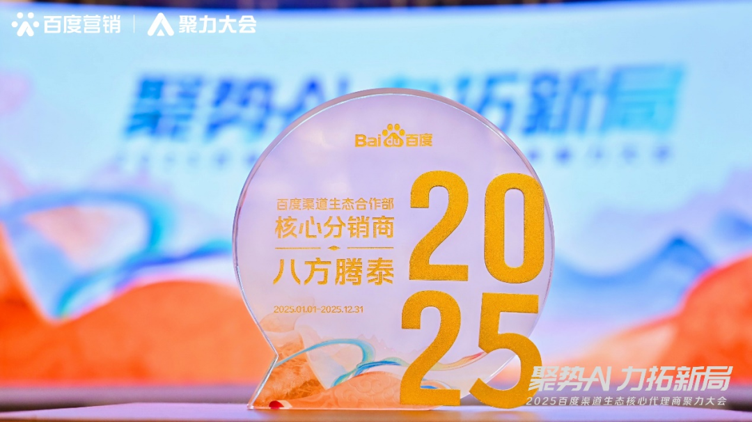 在大会颁奖盛典中,八方腾泰以对百度营销生态的卓越贡献,摘得“鼎立巨献奖”。作为头部代理商,公司通过全域资源协同与策略深耕,助力客户实现品效双赢,成为对大盘贡献最大的头部代理商合作伙伴,是推动百度营销生态高质量发展的核心力量。