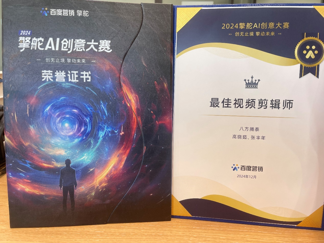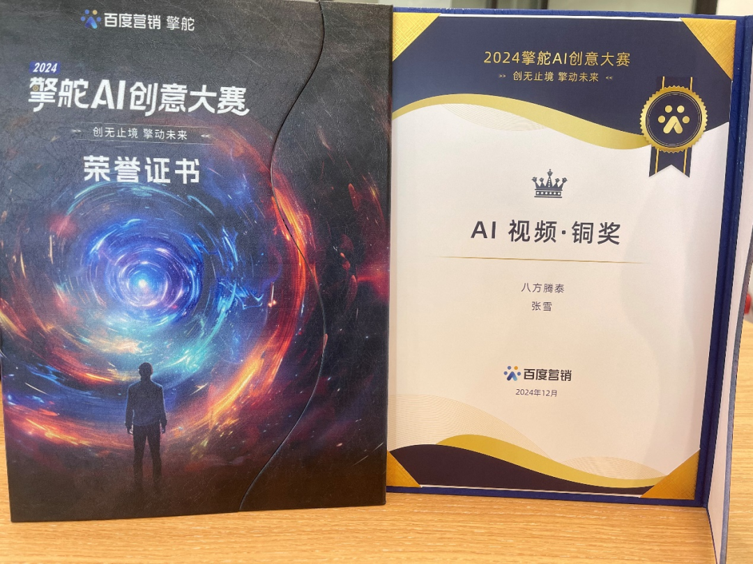 为了挖掘生成式AI技术在营销创意中的潜力,百度营销官方携手擎舵共同发起了《创无止境,擎动未来——2024擎舵AI创意大赛》,此次大赛历时三个多月,吸引了400余名设计师、视频创作者和优化师等创意人才积极参与,最终,八方腾泰在大赛中获得了最佳视频剪辑和AI视频铜奖两项大奖。
