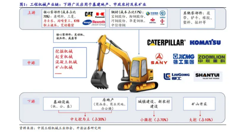 作为经济的晴雨表,工程机械上下游与宏观经济密切相关。工程机械的上游是钢材、核心零部件(比如液压系统、发动机等),下游是应用端的水利、电力和道路等基础设施建设,以及房地产开发、矿山开采等。往往工程机械的销量与经济活动热度密切相关。
