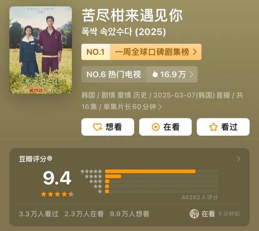 最近,韩剧《苦尽柑来遇见你》爆了,开播就豆瓣评分9.4分,被无数观众奉为今年的“剧王”。