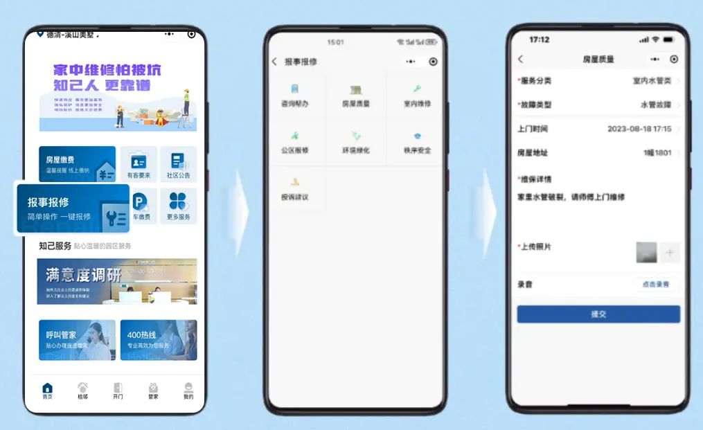 当深夜11点的水管爆裂不必焦急等待天亮,当出差途中突然想起未缴的物业费,当发现小区树木遮挡采光需要修剪……