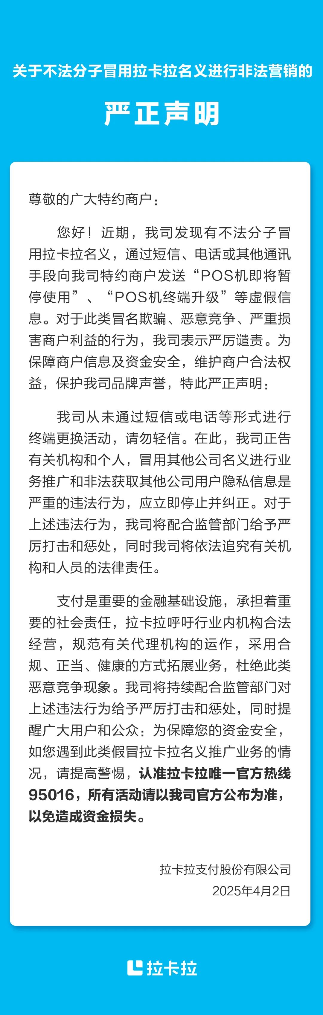 关于不法分子冒用拉卡拉名义进行非法营销的严正声明