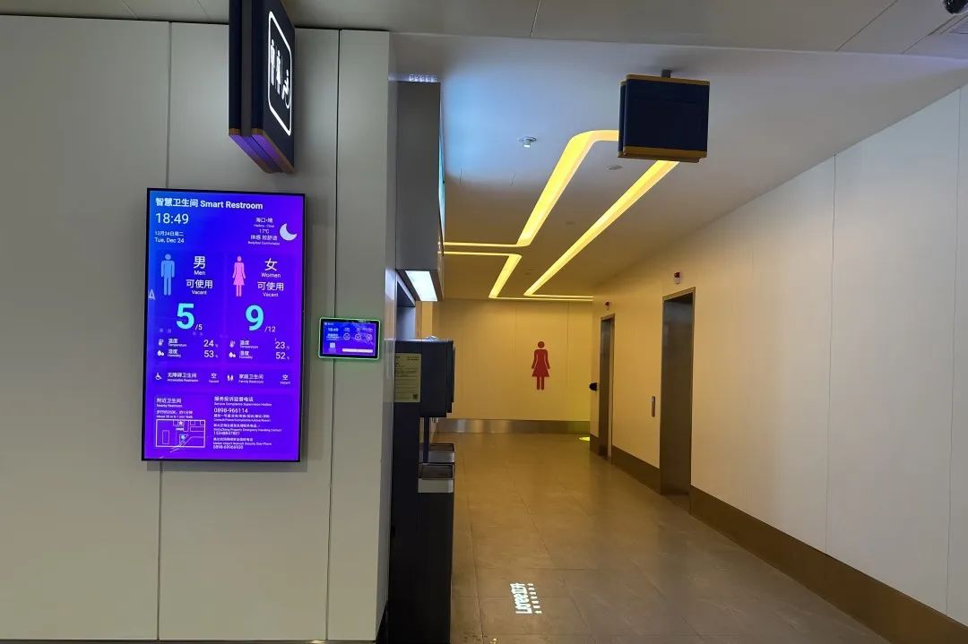 如今,当旅客步入美兰机场智能卫生间,通过环境监测屏幕及红绿灯标识,温度、湿度、厕位使用状态及空气质量等信息一目了然,离开前还可通过满意度评价系统,实时对卫生间进行打分,便于美兰机场收集旅客真实体验,改进服务质量。