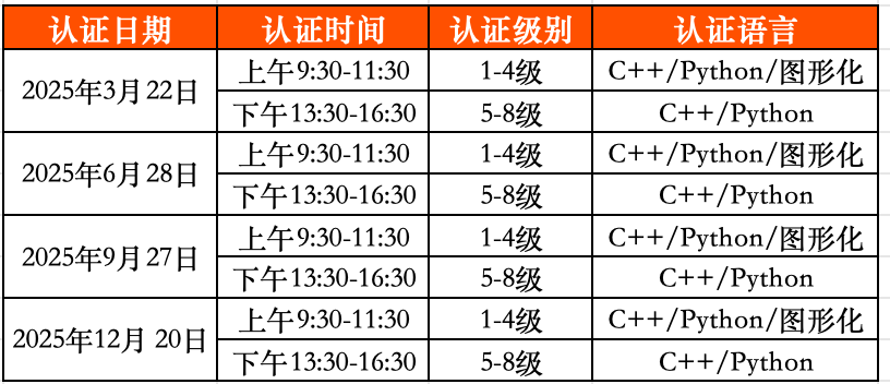 GESP等级认证每年共举办4次,分别在3月、6月、9月、12月。以下为2025年考试时间安排: