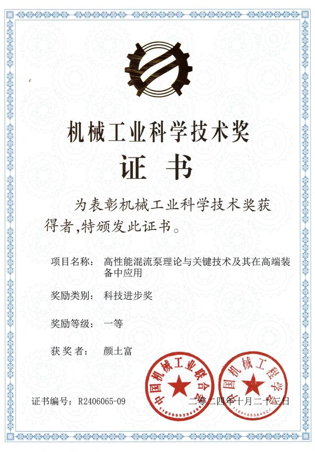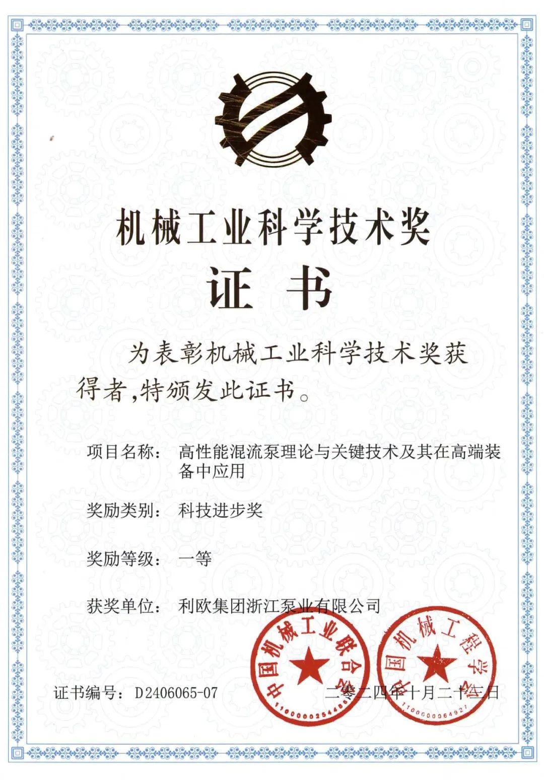 由江苏大学牵头,利欧泵业作为主要完成单位之一的《高性能混流泵理论与关键技术及其在高端装备中应用》项目荣获“2024年度中国机械工业科技进步奖”一等奖。