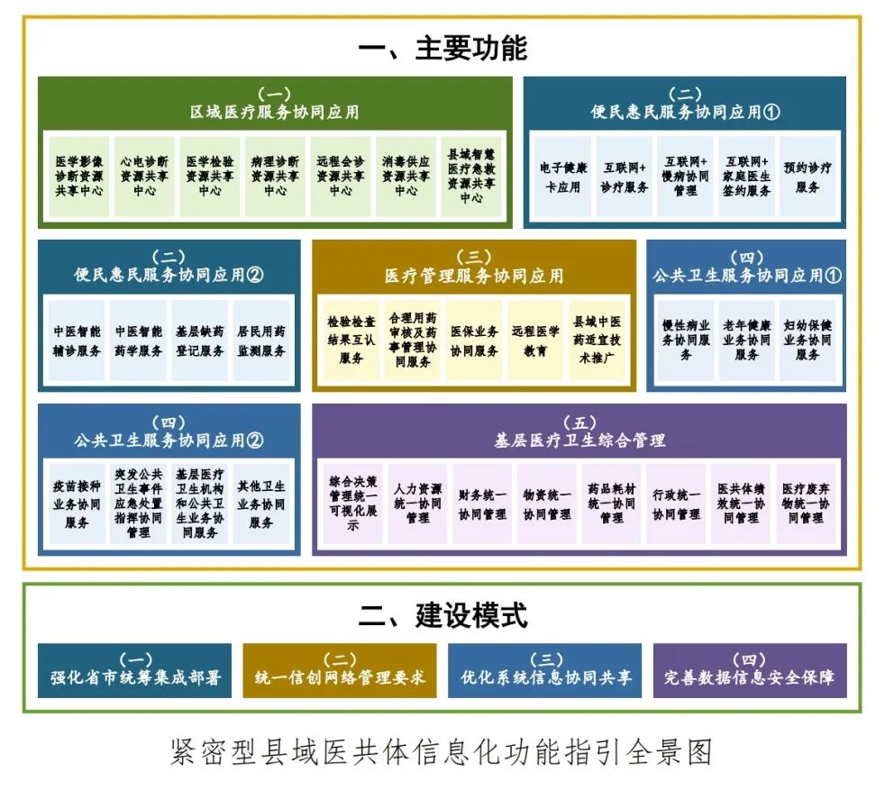 《通知》分为两个部分。第一部分主要功能,包括紧密型县域医共体信息化5个方面36项功能;第二部分建设模式,包括强化省市统筹集成部署、统一信创网络管理要求、优化系统信息协同共享、完善数据信息安全保障等4个方面。