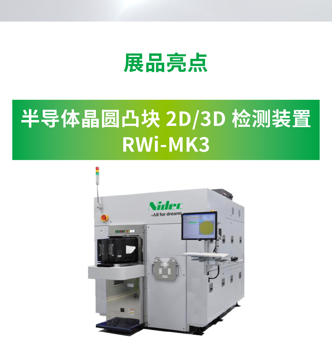 尼得科精密检测设备(浙江)有限公司将展出半导体晶圆凸块2D/3D检测装置RWi-MK3,用来检测半导体晶圆上的金、铜、锡的凸块高度、凸块直径和表面缺陷。使用激光三角测量传感器、超高分辨率、2D & 3D检测同时进行,不同光源对应不同材质。