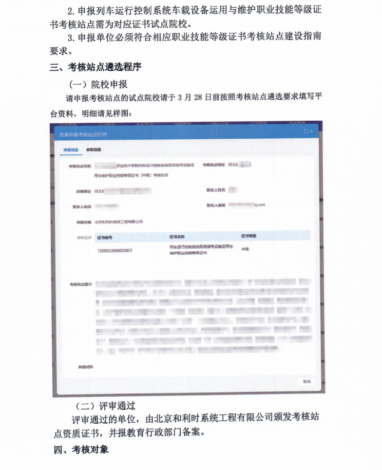 1、依据《列车运行控制系统现场信号设备运用与维护职业技能等级证书考核站点建设指南》、《列车运行控制系统车载设备运用与维护职业技能等级证书考核站点建设指南》等文件要求,各试点院校提前组织学校内部报名。
