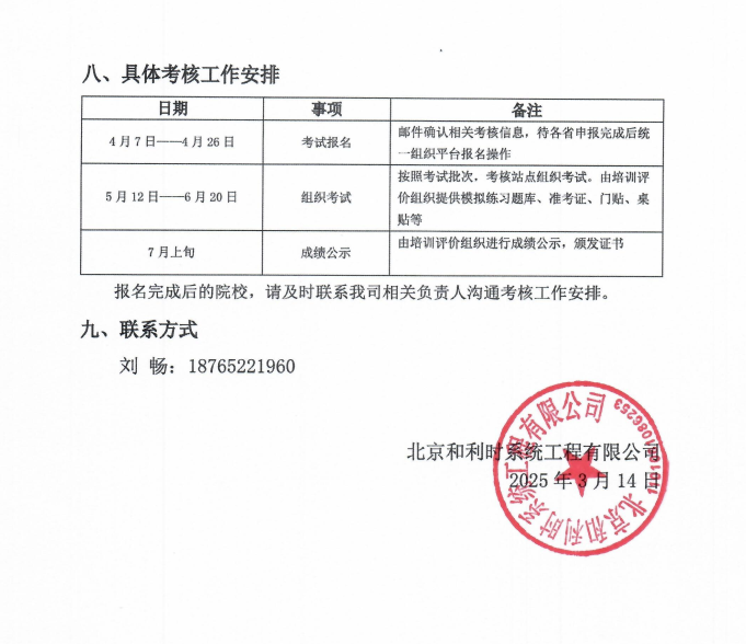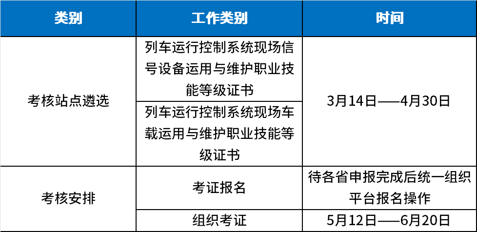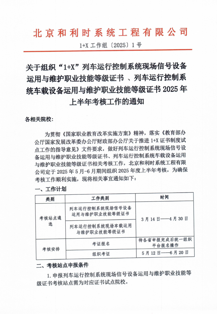 为贯彻《国家职业教育改革实施方案》精神,落实《教育部办公厅国家发展改革委办公厅财政部办公厅关于推进1+X证书制度试点工作的指导意见》文件要求,做好列车运行控制系统现场信号设备运用与维护职业技能等级证书、列车运行控制系统车载设备运用与维护职业技能等级证书相关考核工作,北京和利时系统工程有限公司定于2025年5月-6月期间组织2025年度上半年考核,为确保考核工作顺利实施,现将相关事宜通知如下: