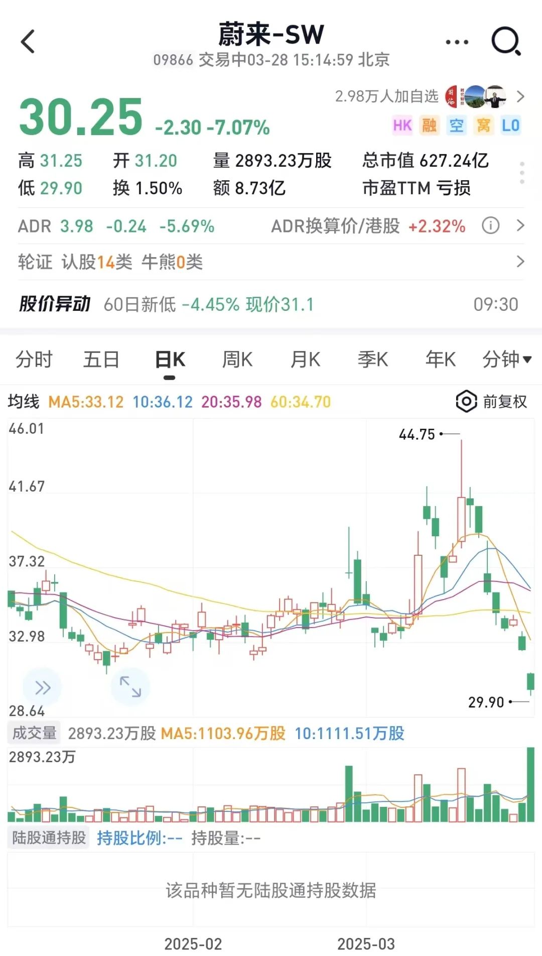 蔚来股价开盘跳水,截至发稿跌超7%,最新市值627亿港元。