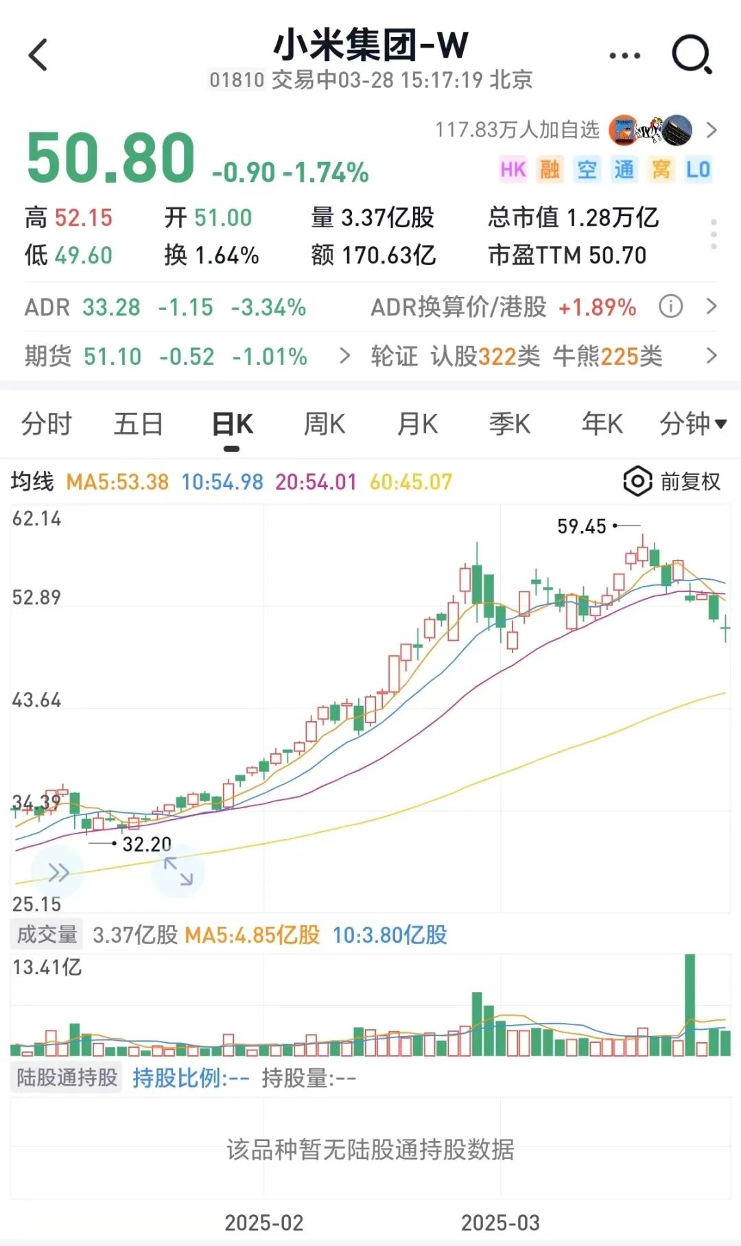 小米集团自3月19日历史最高点59.45港元/股以来回调超13%。
