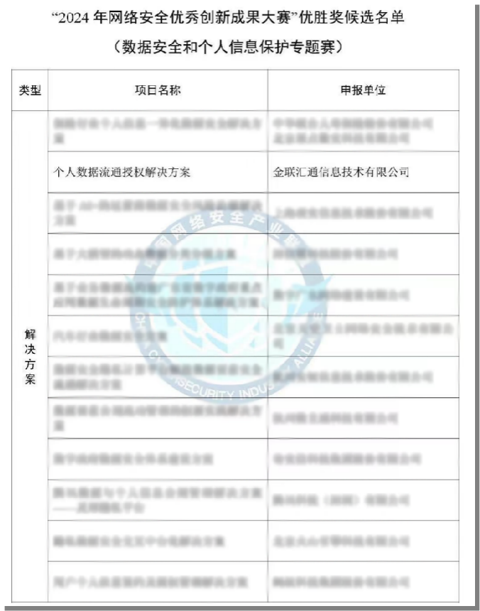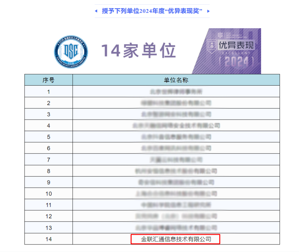 近日,中国网络安全产业联盟(CCIA)数据安全工作委员会公布了 2024 年度表彰名单,金联汇通信息技术有限公司有幸位列其中,荣获 “优异表现奖”。