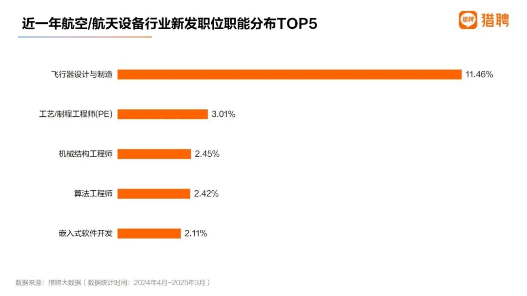 猎聘大数据显示,近一年,在航空/航天设备行业新发职位职能分布TOP5中,“飞行器设计与制造”以11.46%的占比位居首位,远超其他职能。