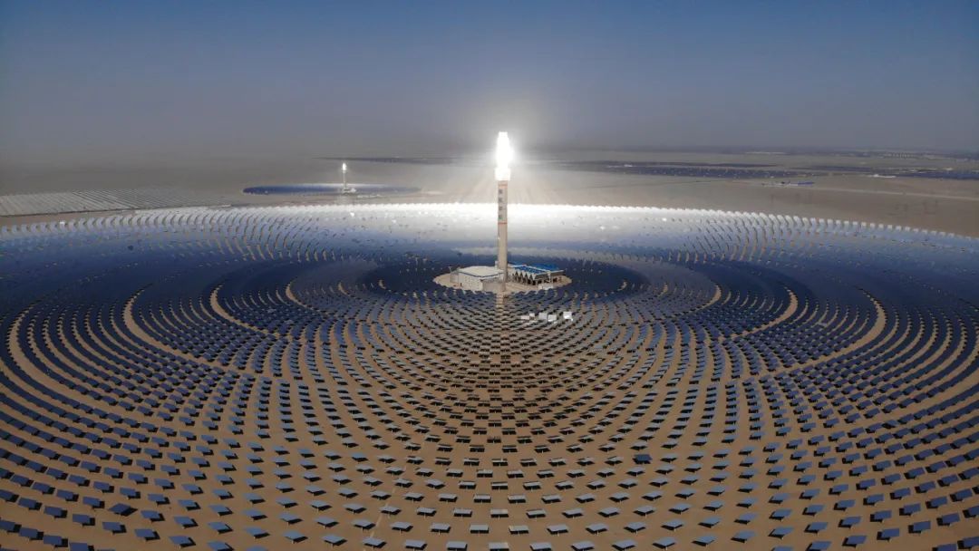 在丝绸古道上的敦煌戈壁,屹立着一座光热电站,仿佛戈壁上的一片“蓝海”。这里是首航高科敦煌100兆瓦熔盐塔式光热电站项目。