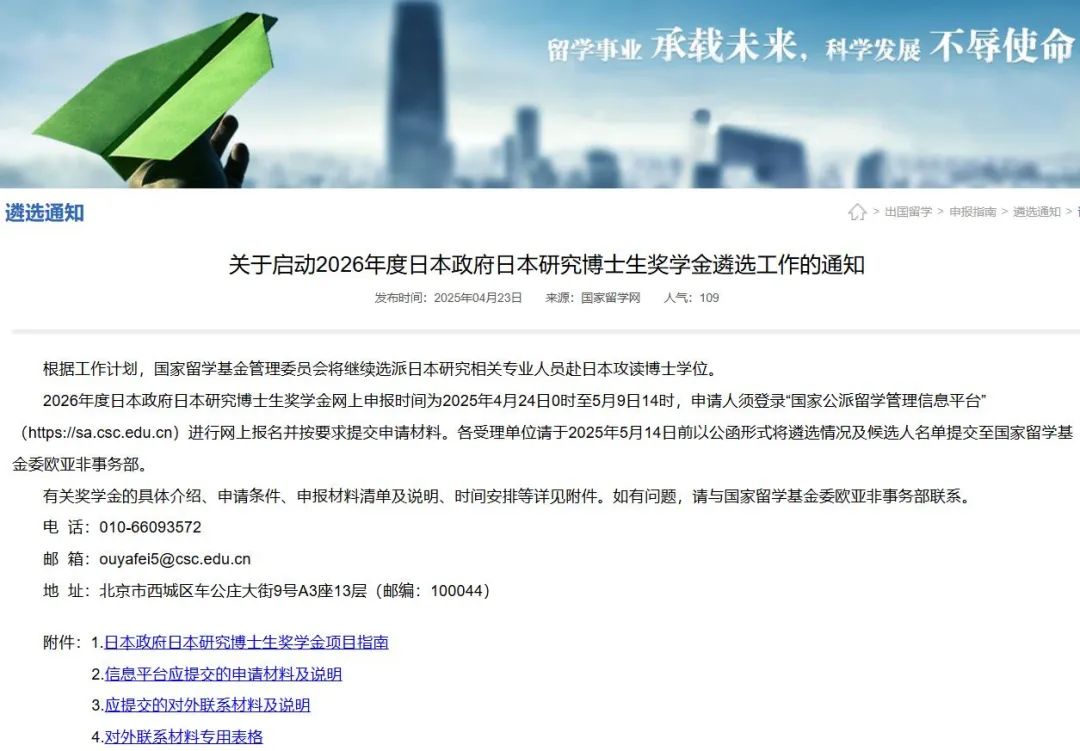 2026年度日本政府日本研究博士生奖学金网上申报时间为2025年4月24日0时至5月9日14时,申请人须登录“国家公派留学管理信息平台”(https://sa.csc.edu.cn)进行网上报名并按要求提交申请材料。各受理单位请于2025年5月14日前以公函形式将遴选情况及候选人名单提交至国家留学基金委欧亚非事务部。