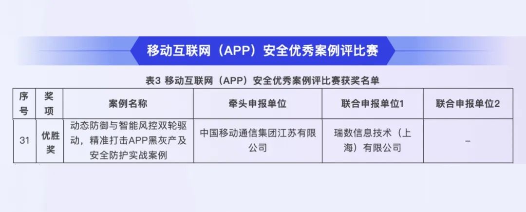 ▪与中国移动通信集团江苏有限公司联合申报的“动态防御与智能风控双轮驱动,精准打击APP黑灰产及安全防护”实战案例,斩获移动互联网(APP)安全优秀案例评比赛优胜奖。
