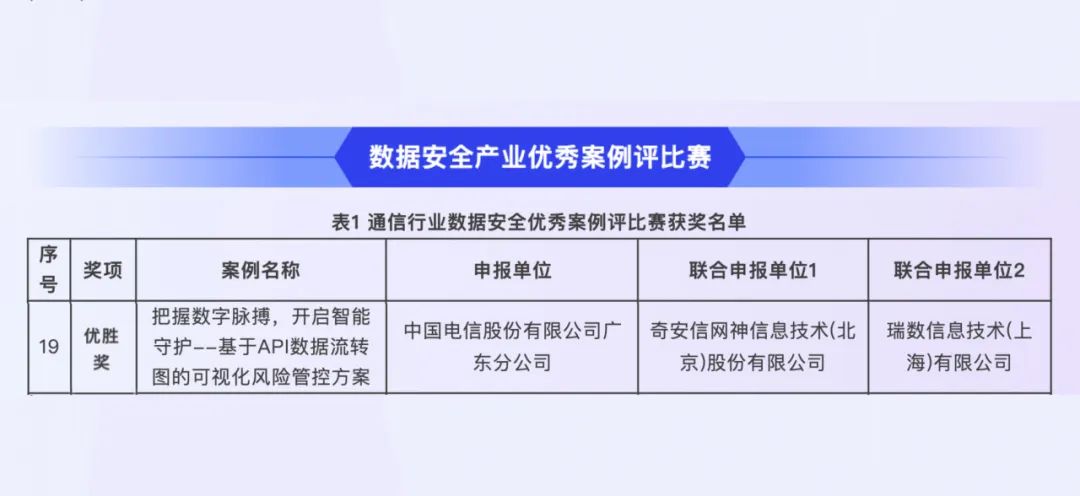 ▪与中国电信股份有限公司广东分公司联合申报的“把握数字脉搏,开启智能守护——基于API数据流转图的可视化风险管控方案”,斩获数据安全优秀案例优胜奖。